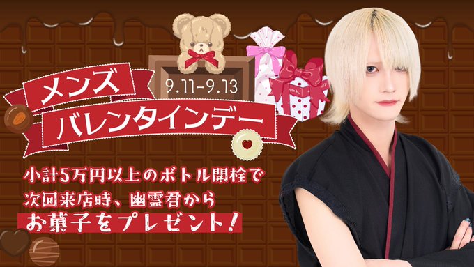 たいよう☀️幽遊屋敷の常夏ニキ@yuyu_taiyou_·たいよういん☀️ 今日のイベは『メンズバレンタインデー』 小計5万円以上のボトル開栓でお菓子プレゼント✨ 元パティシエが『手作り』お菓子プレゼントしちゃうんやから😈 このチャンスを見逃すな✨ ご予定はDMにて!119484