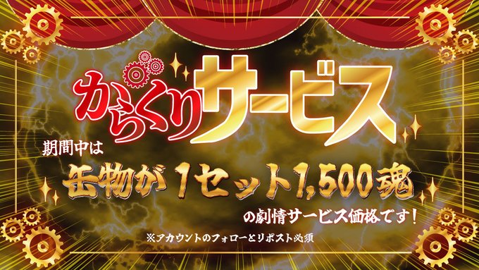 ねこざわ なぎ🈂️さんがリポスト幽遊屋敷👻男装コンカフェ@uuyashiki_danso·8月25〜28日のイベントはこちら! 【 からくりサービス ✨⚙ 】 ヴーヴリッチがなくなっちゃったので!緊急開催! 期間中は缶物が『 劇情価格 1500魂 』 お得すぎる!!来るしかないです!! ご来店お待ちしております!🙇♂️🙇♂️521,862