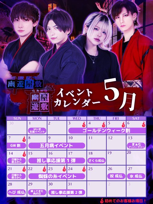 あまなつ🧸🪡幽遊屋敷@yuyu_amanatu·2時間5月も楽しそうなイベントが盛りだくさんだねぇ–◜~◝⸝⸝! 詳しくは公式Twitterをチェックしてね!引用ツイート幽遊屋敷👻男装コンカフェ@uuyashiki_danso·2時間⛩️5月のイベント情報⛩️ 😘5月も宴を盛り上げる ( ´艸`)イベントをご用意 特に🔥マークのついている日は 初めてのお客様にとってもお得!! 当店のTwitterのフォローなど 各種条件は是非ご来店の日の 「固定ツイート」をご覧ください! #秋葉原 #コンカフェ #メンコン2