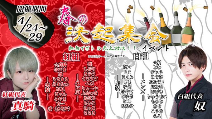 きゆう4/30卒業🌸@yuyu_kiyu·2時間髪赤いから紅組、、? わかりやすいね引用ツイート幽遊屋敷∞メンズコンカフェ@uuyashiki_akiba·7時間🔥開戦🔥 4/24~29の五日間 春の決起集会イベント! 幽霊たちが紅白に分かれて売上対決?! チーム分けは画像をご参照ください! 本気でやります👊 #秋葉原 #コンカフェ #メンコン3
