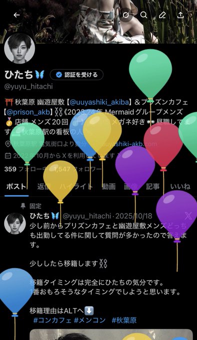 しまっぽ🏝幽遊屋敷@yuyu_shima_·13時間今日20:00~予定だけど遅れるかもなのでご用の方はDMください諸々調整します…!引用しまっぽ🏝幽遊屋敷@yuyu_shima_·11月15日👻11月残り浮遊日👻 初心に戻るというか、まだまだ頑張らなあかんなということで浮遊日数を元に戻しました🙋♂️ いつでも来てください11月後半もお待ちしてます‼️ #男装 #男装喫茶 #男装カフェ #コンカフェ #中性 #秋葉原 #アキバ #メンコン1172