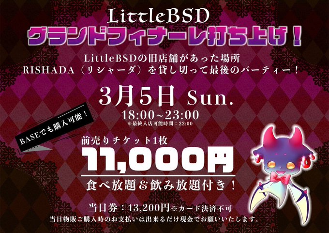 小悪魔居酒屋😈LittleBSD🥀3月5日グランドフィナーレ🍷@little_bsd·1時間😈当日券について😈 本日のグランドフィナーレですが当日券完売いたしました! チケットご購入済みの方のみご参加いただけます!✨引用ツイート小悪魔居酒屋😈LittleBSD🥀3月5日グランドフィナーレ🍷@little_bsd·2月28日😈小悪魔インフォメーション😈 いつもlittleBSDをご愛顧いただき誠にありがとうございます。 3月に関するお知らせです! 1日(水)から最後までお休み無しです🥀 詳しくは画像をご覧下さい✨ 5日(日)のチケットは前日まで販売します🎉 人間様方の宴へのご参加を小悪魔一同心よりお待ちしてます😈🥀9