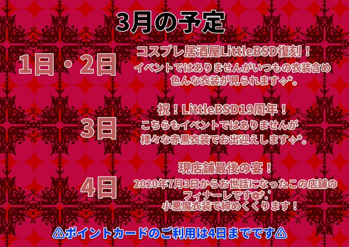 小悪魔居酒屋😈LittleBSD🥀3月5日グランドフィナーレ🍷@little_bsd·😈小悪魔インフォメーション😈 いつもlittleBSDをご愛顧いただき誠にありがとうございます。 3月に関するお知らせです! 1日(水)から最後までお休み無しです🥀 詳しくは画像をご覧下さい✨ 5日(日)のチケットは前日まで販売します🎉 人間様方の宴へのご参加を小悪魔一同心よりお待ちしてます😈🥀6