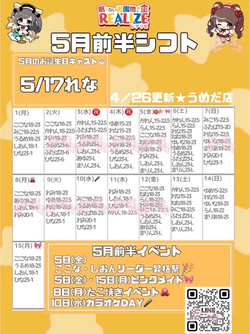 りょう子@nemurea_ryoko·5月後半のシフトです! 来れる日あれば教えてクレメンス💦3