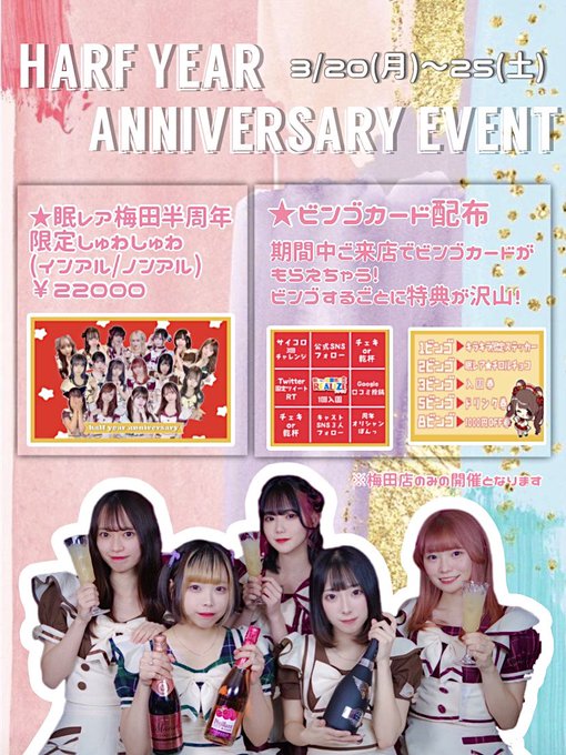 全力❕こ んㄘゅ♡︎3.25卒業@kon_realize·実は卒業の日が周年最終日なんですよね〜(◜ᴗ◝ ) 眠レア半年ありがとうの気持ちを込めて卒業致しますわ、、👍🏻引用ツイート【梅田】眠らない遊園地レアリゼ🎠コンカフェ🎪ナイト大量採用予定⭐️@realize_umeda·🌟眠レア半周年イベント🌟 🎡3/20(月)〜25(土)♡ 限定しゅわ(アルコール/ノンアル) ¥22,000 全員にビンゴカード配布🎶 💗【ここな&しおんリーダー昇格】 イベント日は後日発表!このスレッドを表示6