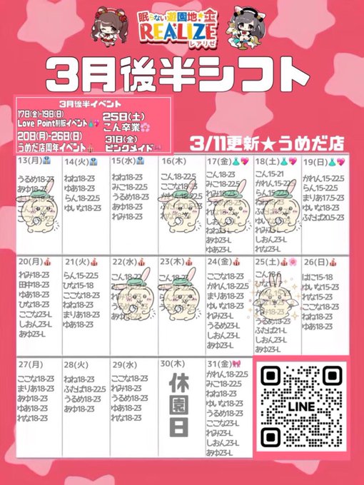 ほしの🧸眠レア@hoshino_shino__·取り急ぎ3月後半シフトです、結構います😖❕4月からはシフト減ると思うので今月たくさん会いたい…❕1