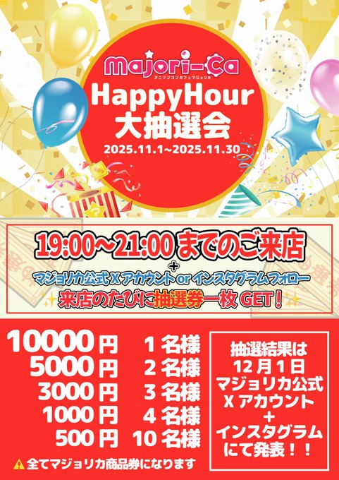 マジョリカ (札幌アニソンコンカフェ)@majori_ca·■□■11月24日(月)19:00~last■□■ 🎊HappyHour大抽選会開催中✨🎊 ♬.*゚縛り解禁𝔻𝕒𝕪♬︎*.:* ■出勤情報■ 19:00~last ▶︎ゆとり ▶︎やもり ▶︎てぃあら http://conceptbar.info/blog_majori-ca/ 近日イベント 11/30 アニソンバーXさんコラボ営業 12/14~20あさひなBDウィーク #コンカフェ14803