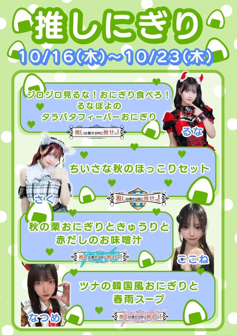 せな🐶🐾さんがリポスト推し推せっ!コンセプトカフェ❦@oshiose_concafe·🔲10/21営業時間 18:00-Last🔲 推し推せ1号店 🍙るなちゃんプロデュース推しにぎり🍙 ジロジロ見るな!おにぎり食べろ! るなぽよのタラバタフィーバーおにぎり🕺🏻 キンヤオリシャンも同時開催✨ 18:00 あい@ai_oshiose ふぶき@fubuki_oshiose せな@sena_oshiose ちあ@chia_oshiose 18:30さらに表示7162,203