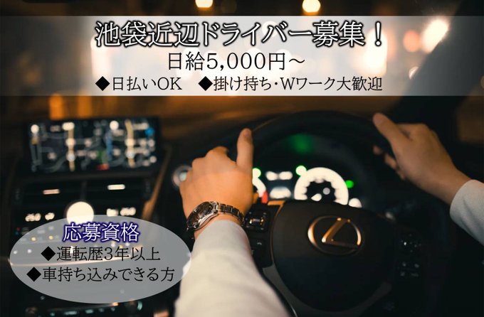cafe&bar chapo 【 池袋コンカフェ 】@cafe_barCHAPO·池袋近辺がメインのドライバー募集!! ◇日払いOK ◇掛け持ち、Wワーク大歓迎 ◇日給5,000円~ ◇ 応募資格…運転歴3年以上の方 応募はこちらまで👇 https://lin.ee/9oP9ReX #求人 #高収入 #日払い #ドライバー #稼げる #アルバイト #高時給 #バイト #高収入求人 #池袋求人 #副業 #高収入バイト