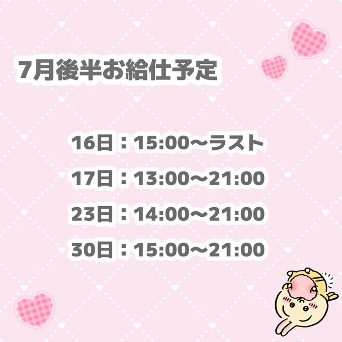 7月後半です!!!!! 遅めの時間居ますお約束どしどし待っております☝️ 16日 20-25 19日 20-25 20日 17-20 22日 19-25 25日 19-25 26日 18-23 28日 19-25 29日 19-25