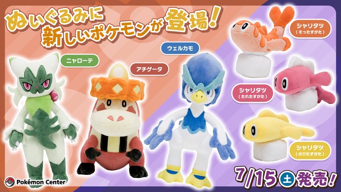 しゃりたつー!!!!!!!!!! 7月15日(土)、『ポケットモンスター スカーレット・バイオレット』で活躍するポケモンたちのぬいぐるみが、ポケモンセンターに登場! ニャローテ・アチゲータ・ウェルカモ・シャリタツが、新たに仲間入りするよ。 ぜひチェックしてね! https://pokemon.co.jp/goods/2023/07/230707_to04.html… #ポケモンセンター