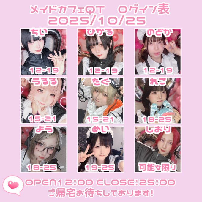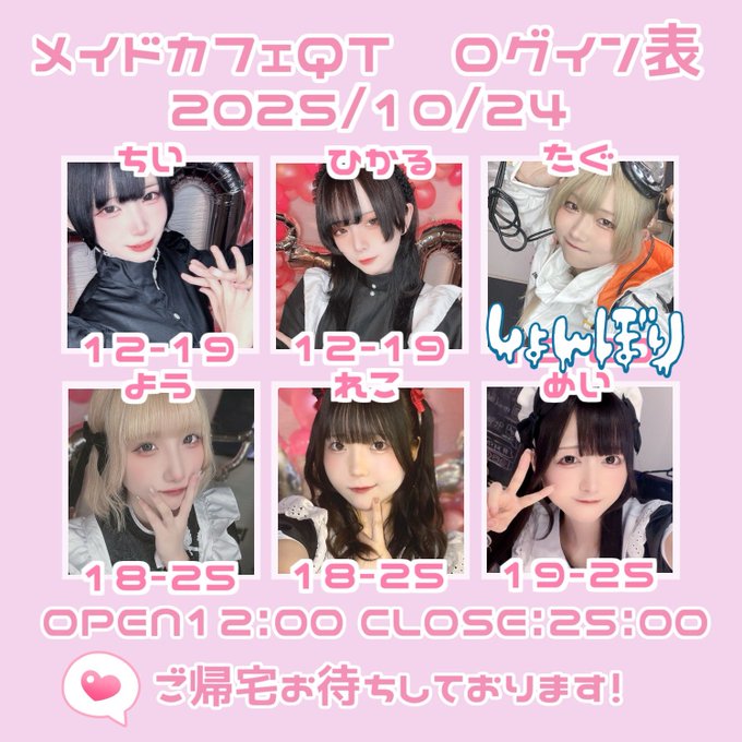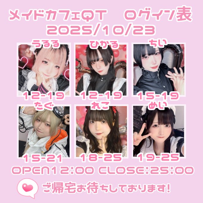メイドカフェQT@QT_98_·🎀メイドカフェQTオープンしました🎀 ご帰宅お待ちしております🏠✨ たぐちゃんは体調不良のため本日お休みです😢312329