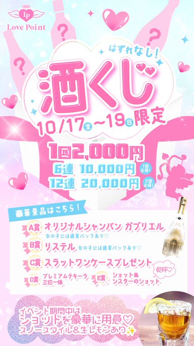 にるね🩵ラブポイントさんがリポスト♡Cafe LovePoint オタロード店♡@Cafe_LovePoint·ㅤ ㅤ🍸週末イベントのお知らせ🍸 ㅤ ㅤお仕事終わり、パーッといきませんか?🍻 ㅤ ㅤ10/17(金)〜10/19(日)の3日間限定🍾✨ ㅤ酒くじイベント開催ですっ!! ㅤ ㅤ1回2000円から、はずれなし🎯 ㅤ6連・12連なら、シスターちゃんとも ㅤさらに盛り上がること間違いなしっ💖さらに表示16175,956
