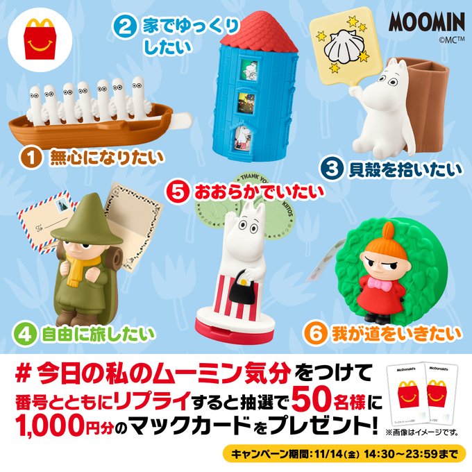 正方形のプロフィール画像マクドナルド@McDonaldsJapan·あなたの今日の気分を「ムーミン」にたとえると? この投稿に #今日の私のムーミン気分 をつけて、番号とともに本日11/14(金)中にリプライで教えてね! 回答していただくと、抽選で50名様にマックカード1,000円分をプレゼント! キャンペーン詳細は画像をタップ!キャンペーン詳細はこちらmcdonalds.co.jpから1,46147799111万