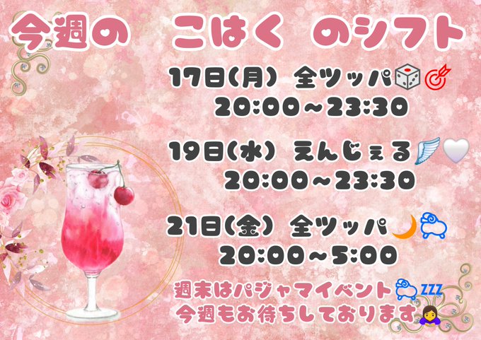 固定こはく@AGLpro_kohaku·今週のこはくのシフト🌙 ✧• ─────────── •✧ 17日(月) 全ツッパ🎲🎯 20:00~23:30 19日(水) えんじぇる🪽🤍 20:00~23:30 21日(金) 全ツッパ🌙🐑 20:00~5:00 ✧• ─────────── •✧ 週末はパジャマイベント🐑💤 今週もお待ちしております❣️268