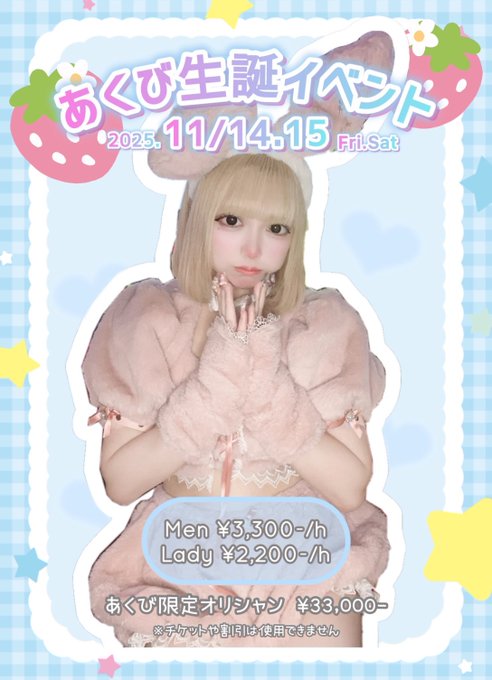 こはくさんがリポストあくび@AGLpro_akubi·🍓あくび生誕イベントのお知らせ🍓 11/14-15日でイベントさせていただきます❣️ 人生初のイベントでふあんとわくわくですが 楽しい2日間にしたいです、まってますっ❣️ 。.。:+* ゚ ゜゚ *+:。.。:+* ゚ ゜゚ *+:。.。.。:+* たくさんお祝いしてください🎂 そしてたくさん飲ませてください(TT)🎶616479