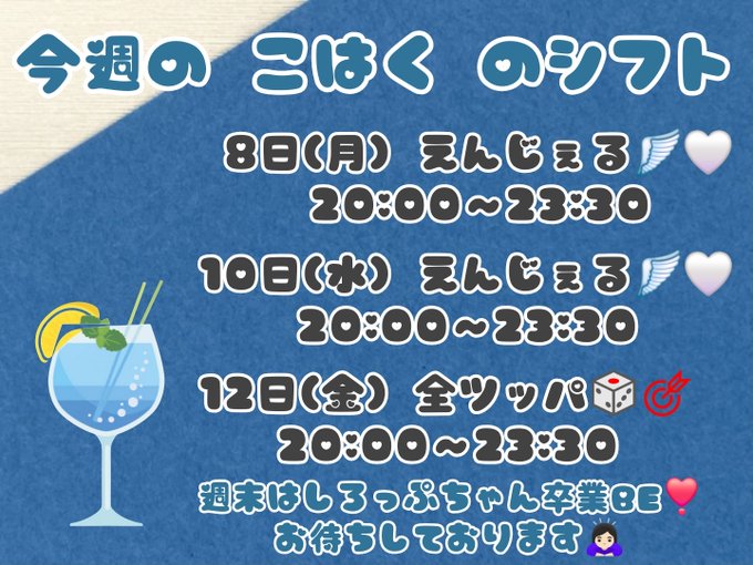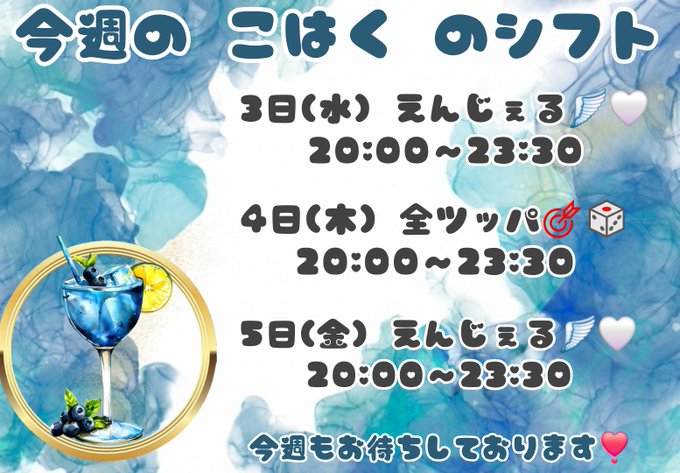 固定こはく@AGLpro_kohaku·今週のこはくのシフト✨ ✧• ─────────── •✧ 8日(月) えんじぇる🪽🤍 20:00~23:30 10日(水) えんじぇる🪽🤍 20:00~23:30 12日(金) 全ツッパ🎲🎯 20:00~23:30 ✧• ─────────── •✧ 週末はしろっぷちゃんBE卒業イベ🌸 今週もお待ちしております🙇♀️37