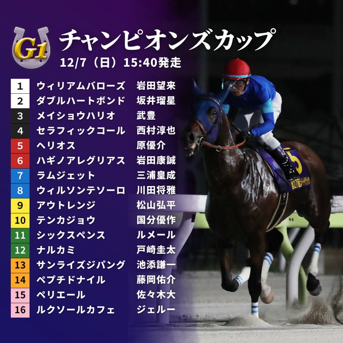 こはく@AGLpro_kohaku·22時間ボンドちゃんそんな内枠いけるの!? いや、みやこS初の牝馬勝利、重馬場でのレコードを達成しているんだ、枠とか関係なく馬券内だ… テソーロも4枠!川田、信じてるからな。 個人的にはカフェも期待しております引用正方形のプロフィール画像JRA-VAN公式@JRAVAN_info·23時間【#チャンピオンズカップ】枠順が決定!👏 ジャパンダートクラシックの覇者ナルカミは6枠12番、みやこSを制したダブルハートボンドは1枠2番、武蔵野Sを勝ったルクソールカフェは8枠16番となりました。#チャンピオンズC1479