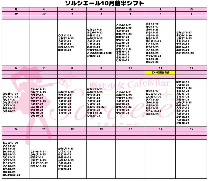 ソルシエール@魔法少女コンセプトCafe&Bar@sorciere_osk·〜本日(10/2)の魔法少女〜 17- おこのちゃん @_ohkono_ ある @sorciere_aru うさ @sorciere_usa 17:30- かなぴ @sorciere_kanapi 18- みる @miru_sorciere せれす @celes_sorciere 遠隔サイト http://sorciereosk.official.ec/?s=09 #コンカフェ #大阪 #コンカフェ営業 #ソルシエール #コンカフェ大阪3384