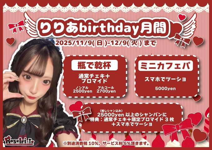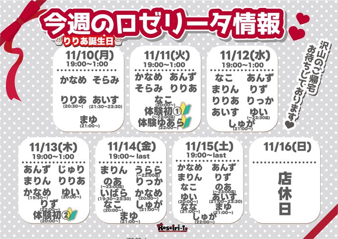 固定リボンメイドカフェ ロゼリータ 札幌すすきのコンカフェ@ribbon_cafe_·11月10日(月) 営業時間19:00-1:00 🎂りりあ誕生日🎂 かなめ@02k_roselri_ta そらみ@Rose_sorami りりあ20:30-last @Rose__riria あいす21:30-23:30 @rose_lce_ まゆ21:00-last @Rose_mayuuu #札幌コンカフェ #ご新規様大歓迎2141