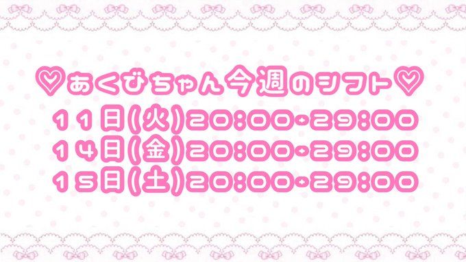 あくび@AGLpro_akubi·今週のシフトこちらです(ᐡᴗ ̫ ᴗᐡ)🍓 いよいよあくびバースデーです❣️ 緊張してますが絶対に楽しませます︎^_^🎶 なのでぜひきてくださいꌩ ̫ ꌩ💧 お待ちしておりますよ〰️❣️8136