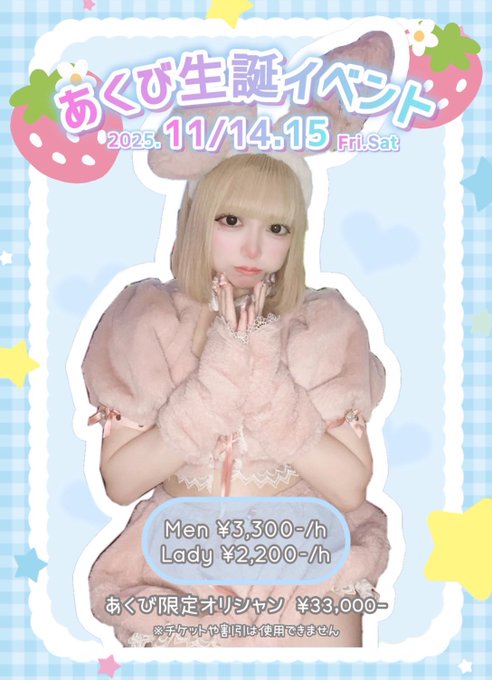 あくび@AGLpro_akubi·7時間ほんじつこちら🥺 みなさんぜひお祝いしにきてください🍓 遠方からのお祝いもプロフィールから 遠隔のサイトに飛べるのでぜひꌩ ̫ ꌩ💧引用あくび@AGLpro_akubi·11月6日🍓あくび生誕イベントのお知らせ🍓 11/14-15日でイベントさせていただきます❣️ 人生初のイベントでふあんとわくわくですが 楽しい2日間にしたいです、まってますっ❣️ 。.。:+* ゚ ゜゚ *+:。.。:+* ゚ ゜゚ *+:。.。.。:+* たくさんお祝いしてください🎂 そしてたくさん飲ませてください(TT)🎶5122