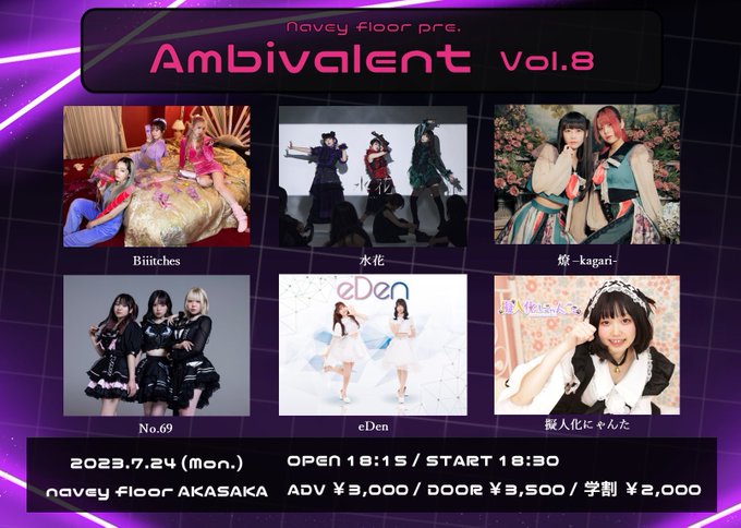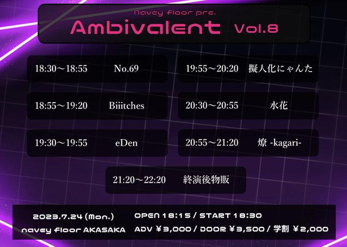 ❤️🔥次の次のライブ❤️🔥 7月24日(月) navey floor AKASAKA 『Ambivalent Vol.8』 OPEN18:15/START18:30 予約3,000円/当日3,500円/学割 2,000円(1D別) 出番20:55~21:20🔥トリ🔥 物販21:20~22:20 🔻来場 https://tiget.net/events/258331 🔻配信 https://twitcasting.tv/c:bluemy0108/shopcart/247860… 🔻通販 https://ka-ga-ri.booth.pm