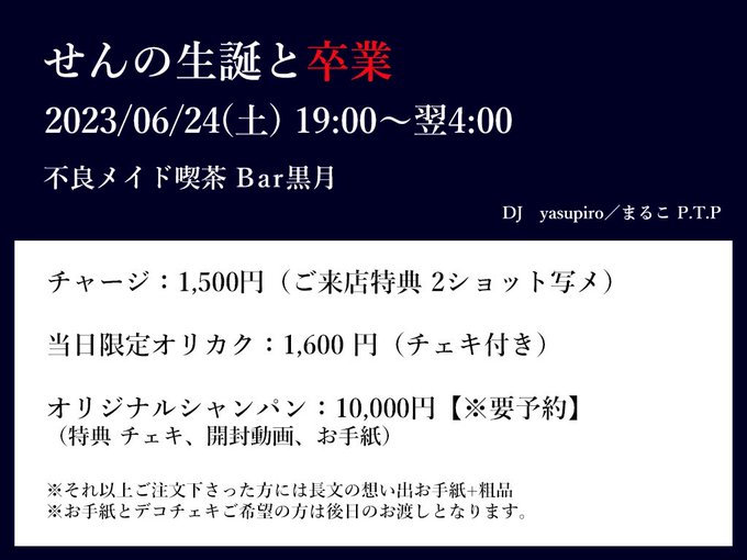 せん 6/24(土)卒業生誕@sen_______mtl__·あっという間ですね!明日のことについて補足がありますのでお目通しください✌️皆んなに会えるの楽しみにしてるよ〜‼️最後一緒にわいわいしようね🥰引用ツイート不良メイド喫茶🐈⬛🌙Bar黒月-KuroTsuki-|横浜|コンカフェ|バー@kurotsuki_bay·2時間【明日✨】2023年6月24日(土) 『せんの生誕と卒業』 1年と2ヶ月一緒に頑張ってくれたせんちゃんの生誕と卒業をお祝いしよう🌸 ⌚時間 19時〜4時(3時半L.O.) 🎟チャージ1,500円 🍹当日限定オリカク1,600円 いよいよ明日です🥲✨17