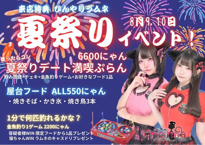 ぷりしーにゃ🐈⬛秋葉原コンカフェ🚨@pricinha_akiba·✩˖°⌖.꙳✩˖°⌖.꙳✩ ✩˖°⌖.꙳✩˖°⌖.꙳✩ 🍧ぷりしーにゃde夏祭りEV🍧 8月9日(土)〜8月10日(日) 16:30~25:00 👘ポリス猫が私服デート服or浴衣 で容疑者様をお出迎え❣️ 🎁来店特典『ラムネ』プレゼント🎁 🏮夏祭りデート満喫ぷらん 6600にゃんさらに表示6111,443