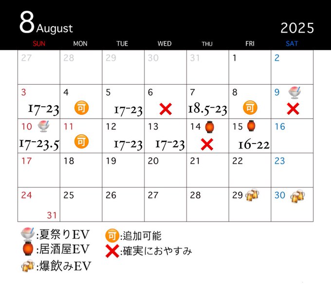 固定みはる@pricinha_miharu·3時間いる日 8/4 19-22:30 8/6 19-22:30 8/9 21:30-25(仮)🌃🍧 8/10 19:30-25🌃🍧 9私服 10浴衣(来てくれるって連絡あれば!)かなーの気持ちです、DMお待ちしております💌🫶🏻🩷引用ぷりしーにゃ🐈⬛秋葉原コンカフェ🚨@pricinha_akiba·7月15日〜🍉ぷりしーにゃ2025年8月月刊カレンダー🌻〜 8月9日〜10日🍧夏祭りEV 8月14日〜15日🏮居酒屋EV 8月29日〜30日🍻爆飲みEV ⭐️深夜営業⤵️ 8月1日、2日 8月8日、9日、10日 8月15日、16日 8月22日、23日 8月29日、30日 #コンカフェ #秋葉原 #秋葉原コンカフェ4296