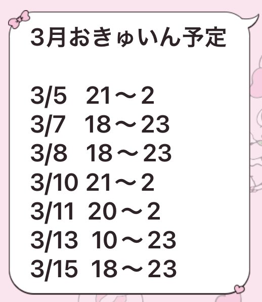 固定かな@coffret那覇@kana_coffret·3月のお給仕予定!!! 1日(日) 21~02 ←最後までいる!!レア! 5日(木) 19~00 ⬆️カラオケday🎤🎶歌えちゃう! 6日(金) 18~00 ←金曜日だよ!!!! 9日(月) 19~23 ←月曜だけど元気だしてこ 13日(金) 18~00 ←またまた金曜日!!! 14日(土) 18~23 ⬆️🌸イベント!!❁⃘*.゚楽しみ✨11234
