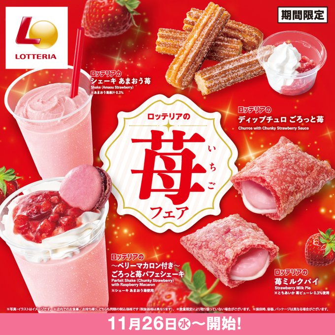 はな🌸みざりーさんがリポストロッテリア@lotteria_pr·/ 新商品情報📢 \ 11月26日(水)より 『苺フェア』がスタートします🍓 苺づくしの4商品を発売いたします‼️ 今年も残りわずか⏰ やり残したこと、食べ忘れているもの、、( ´∀` ) ありませんか?? #ロッテリア #ゼッテリア142,5339,26431万