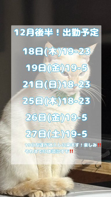 固定あき🐈⬛🖤みざりー@misery_aki·出勤予定です~(՞_ ̫ _՞)" 今年ももう残り少ない…❕楽しもうね^. ̫ .^212313