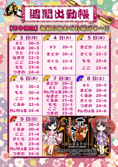 花宵-HANAYOI-🌸札幌コンカフェ@HANAYOI_8741·:∵⌒∵:,_,:∵⌒∵:,_,:∵⌒∵:,_,:∵⌒∵:,_,:∵⌒∵: 【11/3(月)~11/9(日)】 花宵週間出勤表掲載しました🌸 http://hanayoi.jp/schedule-week/ ,:∵⌒∵:,_,:∵⌒∵:,_,:∵⌒∵:,_,:∵⌒∵:,_,:∵⌒∵: #札幌 #コンカフェ #花魁 #すすきの16260