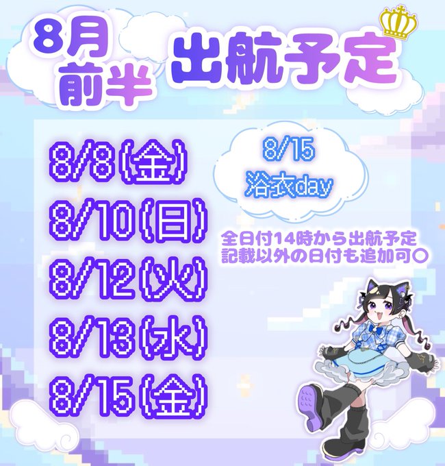 固定しぐれは8月誕生月@sigure_pompom·🎂8月前半出航予定⚓️ 8月13日誕生日です🎉 オリシャン、各種グッズご用意🎶 8月13日来れる人全員来て欲しいよ❕ ゆっくりお話勢は時間相談したいので早めにご予約助かります߹~߹ 既にご予約いただいてる時間もあるのでぜひ!! 8月15日~17日浴衣day🎆 可愛い浴衣着れることになったのでこちらもぜひ🎶23368