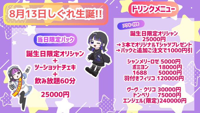 大好きさん爆誕おまつり🥳🥳🥳‼️‼️‼️‼️❤️❤️❤️❤️❤️❤️❤️❤️❤️❤️❤️ ∵✰🌃🌙𝐁𝐋𝐔𝐄 𝐌𝐎𝐎𝐍🌙🌃✰∵ 8/13 12:00- しぐれ(@sigure_BlueMoon ) バースデーイベント決定✨✨ ハタチのバースデーなので お酒解禁です🫧🥂! 是非お越しください(っ ॑꒳ ॑c)💖 ⬇️メニュー詳細⬇️
