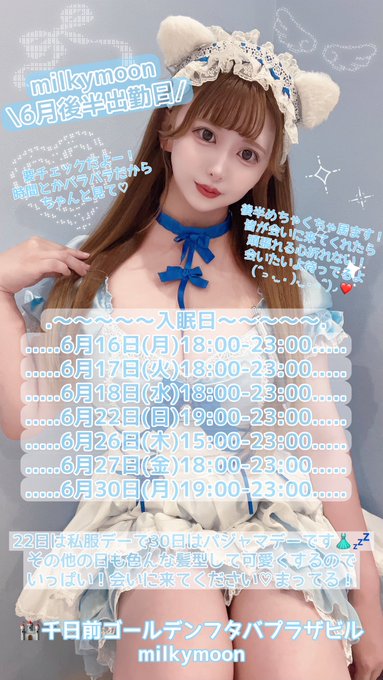 milkymoon🥛🌙@milkymoon_osaka·13日の日曜日! みずき17-23 るい17-23 とろ17-23 やまだ17-23 日曜日楽しみましょう! https://milkymoon.theshop.jp6672
