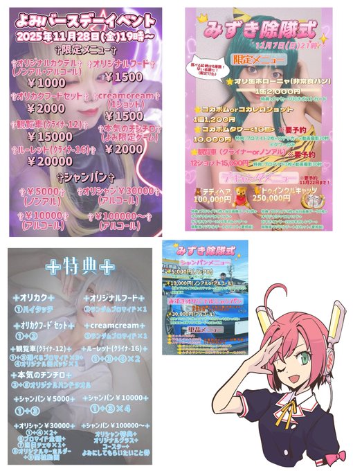 れん@絶対ピューロ行くッ!!@LenMgdoll·8時間本日はしぐれさんバースデーイベントです!みんなでお祝いしましょう🎂引用しぐれ☔️⚡️11/14バースデー@shigure_mgdoll·10月30日11月14日(金) 19時〜 とっても嬉しいことに、しぐれのお誕生日会を開いて貰えるようです💜 もう既に緊張でドッキドキですが、みんなと楽しくお話しながら飲めたら嬉しいです🍾🥂 ④と観覧車以外はノンアルにもできます! DM、お店へのお電話(028-637-0120)でお問い合わせやご予約もお待ちしてます✌🏻685