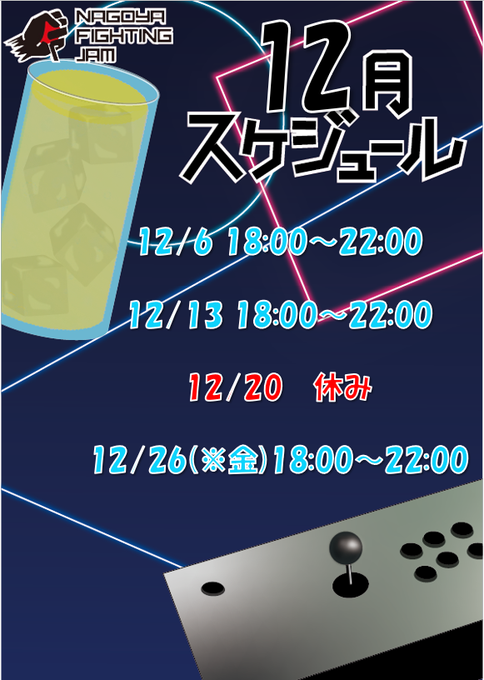 玲乃サマ🍫さんがリポストNFJ(Nagoya Fighting Jam)@NFJ_nagoya·8時間本日予定通り開催します! 残りラスト2回ですのでぜひぜひ遊びに来たください! お待ちしております!引用NFJ(Nagoya Fighting Jam)@NFJ_nagoya·12月2日12月NFJカレンダーです! 11月も皆様ありがとうございました!🙏 ついに2025年ラスト! 今月からたくさんのオフ大会が始まるので、 ぜひNFJで練習していってください! それでは年末に向けて楽しんでいきましょう!⭐️🥊23308