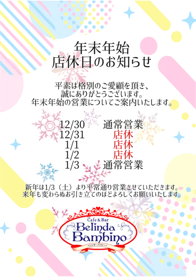 ベリンダの年内は30日まで!