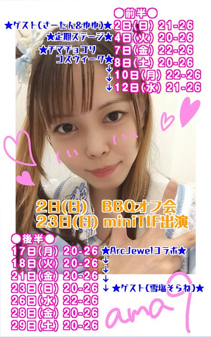 メイリン🩵✨あまきゅー@meiling_ama9·23時間きんおは☀ 今日追加で【21-26時】でいます✨ それとさらに追加で【22日(土)23-26時】で出勤します✨ ただ22日はminiTIF前日なので26時になったら爆速で帰宅します🏯引用メイリン🩵✨あまきゅー@meiling_ama9·11月1日11月🍁メイリンのいる日🩵✨ 🎤定期ステージ♫ 4日(火)21:00🌸 一緒にお酒飲めるよ🍻の日 2日(日) 23日(日) 🎂BIRTHDAY🎂 5日 服部樹里(告白実行委員会) 7日 山本幸大(告白実行委員会) 27日 Gom(HoneyWorks) 29日 榎本虎太朗(告白実行委員会)13193