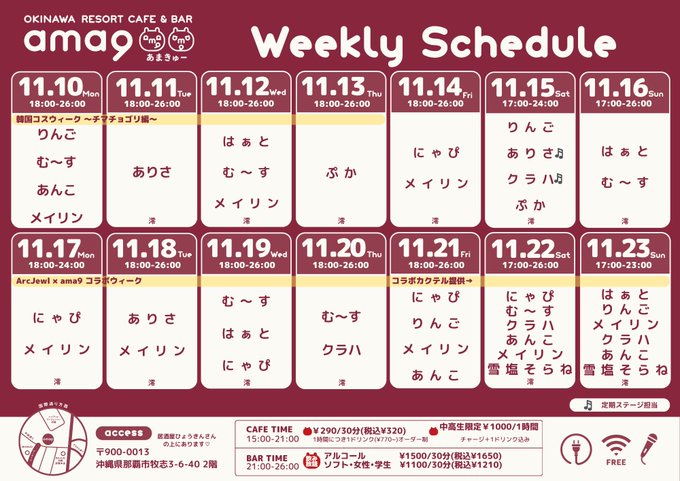 固定ama9(あまきゅー)【公式】沖縄コンカフェ|キャスト募集中@ama9_official·🌺週間スケジュール🌺11/10(月)〜11/23(日) #あまスケ 7日(金) ~ 13日(木)韓国コスウィーク🪷 〜チマチョゴリ編〜 17日(月) ~ 24日(月)ArcJewel × ama9🌟 コラボウィーク お休み💤なし *各イベントの詳細は #あまイベ をご確認ください☝🏻さらに表示53