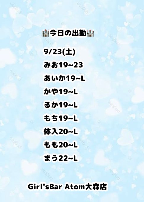 Girl'sBar Atom大森店@Atom_Omori·9/23(土)出勤情報になります!! 🎀みお 🎀あいか@Atom_o_aika 🎀かや@Atom_o_kaya 🎀るか@Atom_ruka 🎀もち@Atom_o_mochi 🎀もも@Atom_o_momo 🎀まう@_m_ux_ ご来店お待ちしております🥰🥰2
