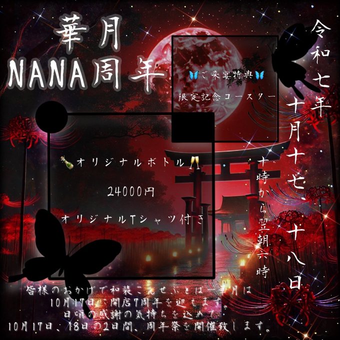 固定◆華月◆2018.10.17開宴!@kagetsu0911·⛩ 華月でございます ⛩ 令和七年十月十五日までのお嬢予定です ・:*+. 夜から朝まで続く宴の場 .:+ 飲み放題 殿◇1時間2600円 姫◇1時間2200円 殿姫のご来宴お待ちしております🌙23367