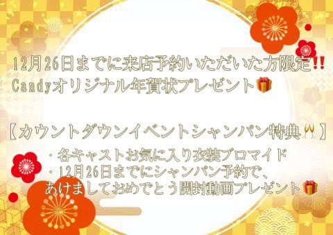 つき🌙@candy_tsuki_·2022年12月31日年越しCANDY急げ!!!!!引用ツイートCANDY🍬@candycafebar·2022年12月20日【告知】 🎍12/31 カウントダウンイベント🎍 31日は朝5時まで営業! CANDYで一緒に新年の締めくくりと カウントダウンをしませんか?☺ 来店予約&シャンパン予約で この日限定の特典をプレゼント🎁 締切は12/26(月)なのでお早めに✨ キャスト一同お揃いの衣装を着て お待ちしております❣ 🧚♀2
