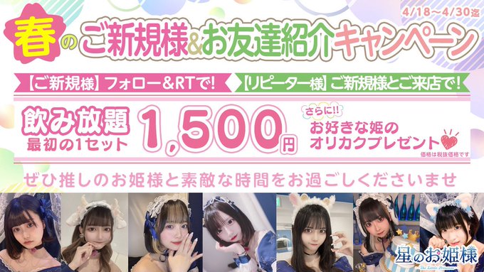 ありかす@arks_hoshihime·2時間やっす⁉️⁉️⁉️⁉️⁉️⁉️⁉️⁉️⁉️引用ツイート星のお姫様🌟秋葉原コンカフェ@hoshihime_akiba·4月17日🌟お知らせ🌟 4月18日(火)~4月30日(日)まで 『春祭りイベント』を開催🌸 フォロー&このツイートをRTで ご新規様は【1セット 1,500円】に💫 他にも特典多数! 詳しくは画像をご確認ください🙇🏻♀️ ご来店お待ちしております🙌🏻💙 #星のお姫様 #ほしひめ #秋葉原コンカフェ #コンカフェ3