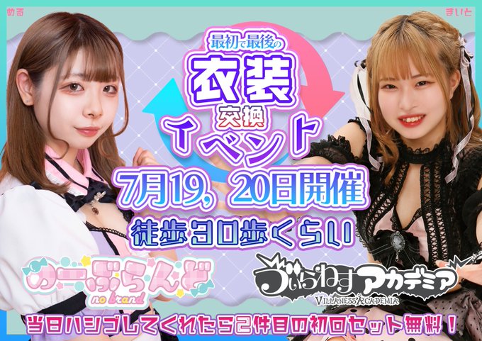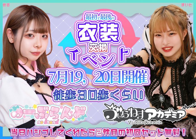 ねーーーーwww深夜に急に召集かかって急遽今日20日(木)18:15〜20:15の2時間だけですが私いることになりました!!!!! 時間こじ開けたからには、会いにきて欲しいな!!!! ╭━━━━━━━━━━━━━━╮ 💓#のーぶらんど × #ゔぃらねす 💓 ╰━v━━━━━━━━━━━━╯ 🐰徒歩30歩ぐらい🚶♀️🍬 👿ゔぃらねすアカデミアさん @VAakihabara_sub と最初で最後の衣装交換イベント🎉 🗓7月19日(水)、20日(木) ✨ハシゴしてくれたら2件目の初回セット無料💰 #コンカフェ