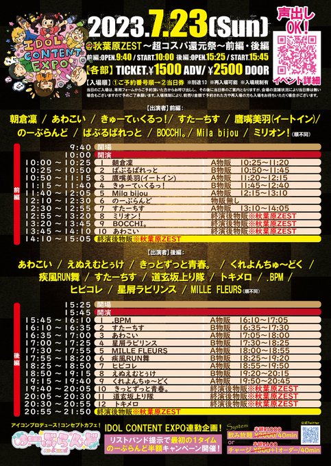 7/23『 #IDOLCONTENTEXPO @秋葉原ZEST ~超コスパ還元祭~前編・後編 』開催決定🎊✨ 各部コスパ抜群で観れちゃうので 推し増しするチャンス✨ ⏰前編:開演10:00 ⏰後編:開演15:45 💰各部:前売1500円※別途1D ※再入場可能 🔽予約URL※2023年7月19日(水)22:00開始 https://tiget.net/events/260413