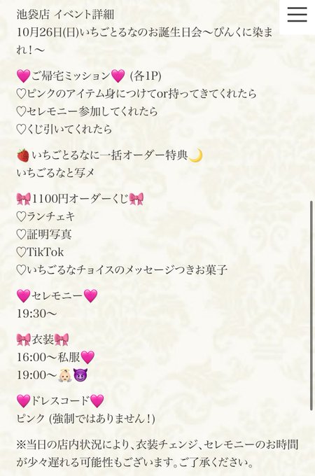 固定ぴあの@みけねこカフェ池袋店@pianomikecat·今週のお給仕予定です(⃔ ꒪꒳꒪̟ )⃕↝ 26日はいちごさんとるなさんのバースデー🎂🎉頑張ってお手伝いさせていただきます!!みんなでいっぱいおめでとうしようね⸜( ´ ꒳ ` )⸝♡︎240