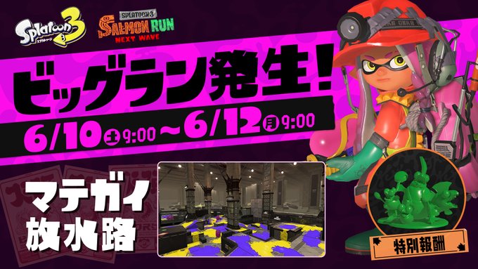 せつな@エルヴィス@setsuna_elvis·2時間やります。💪引用ツイートSplatoon(スプラトゥーン)@SplatoonJP·2時間クマサン商会から、ビッグランのお知らせだ! 「次回のビッグランは、6月10日(土)午前9時~12日(月)午前9時、マテガイ放水路にて発生する見込みですので、ご注意ください。 今回から、ビッグラン中にお渡しするウロコの枚数を2倍に増やします。みなさまのますますのご協力をお待ちしております。」